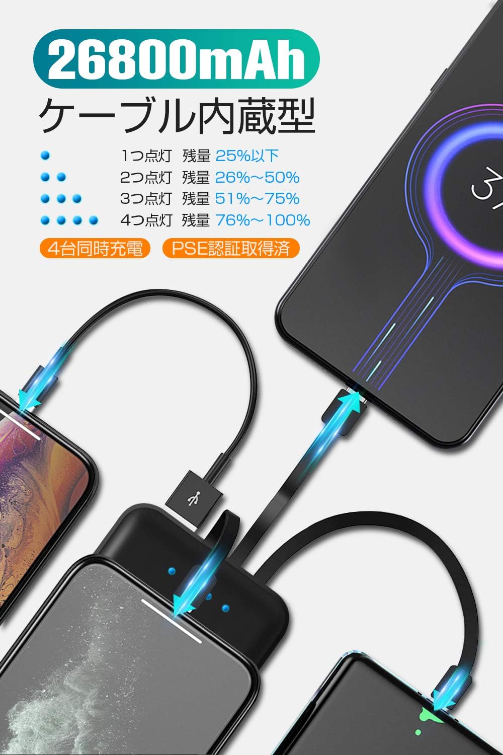 そういう点では、そういうものに惑わされず、ケーブル付きなこのようなモバイルバッテリーがおすすめです。